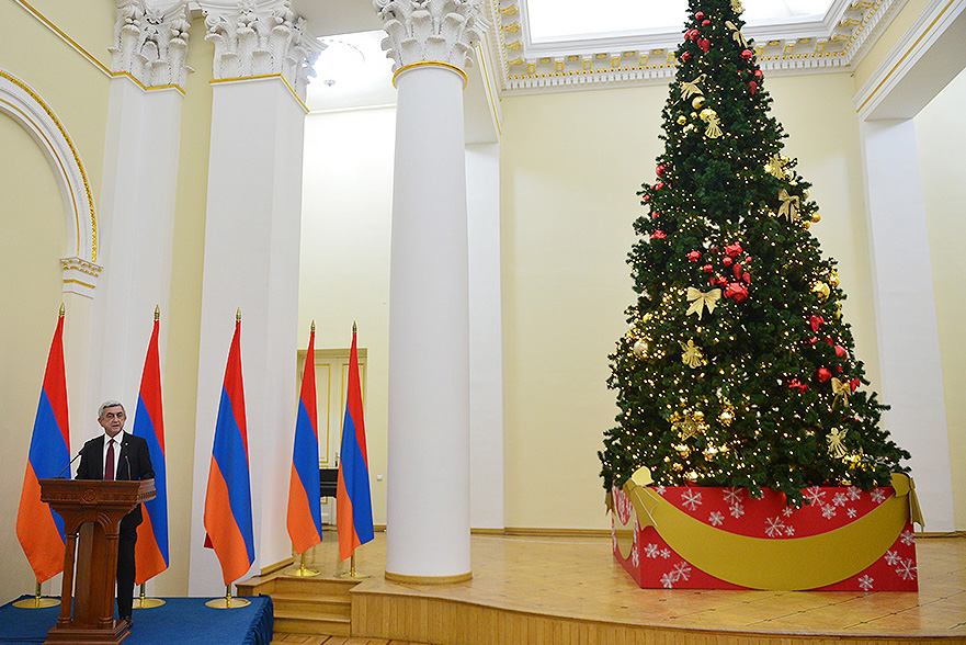 Շնորհավորելով գալիք Ամանորի և Սուրբ Ծննդյան տոների կապակցությամբ` նախագահ Սերժ Սարգսյանը ԶԼՄ–ների ներկայացուցիչներին մաղթեց քաջառողջություն, երջանկություն, արևշատություն և խաղաղություն: «Ձեր աշխատանքային գործունեության մեջ մաղթում եմ նոր ստեղծագործական խիզախումներ, և որ ամենակարևորն է, մաղթում եմ ձեզ, որ հաշտ լինեք առաջին հերթին ինքներդ ձեզ հետ: Սա ամենակարևոր պայմաններից մեկն է»,-իր խոսքը եզրափակեց Սերժ Սարգսյանը: