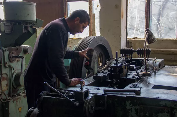 Հարևանությամբ աշխատում է արտադրամասի սակավաթիվ աշխատողներից մեկը, որը դեռ 50 տարեկան չկա։ Նա կանգնում է հաստոցի մոտ, որը կտորներ է պոկում պողպատյա ձողերից և հեղույսներ կտրում դրանցից։