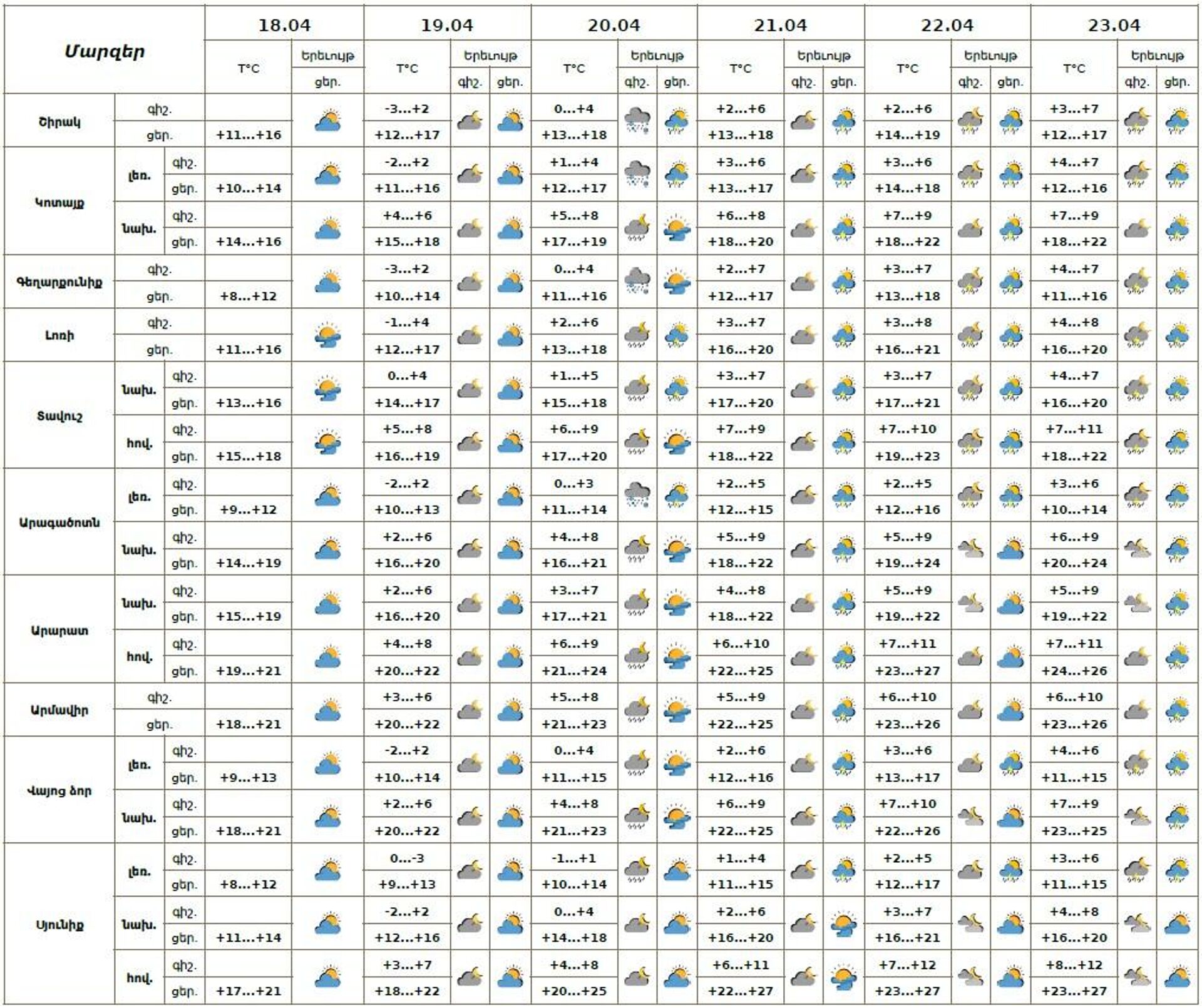 Ապրիլի 21-23-ին առանձին վայրերում սպասվում է քամու ուժգնացում՝ 14- 17մ/վ արագությամբ։ Օդի ջերմաստիճանն ապրիլի 19-22-ին աստիճանաբար կբարձրանա 4-6 աստիճանով։