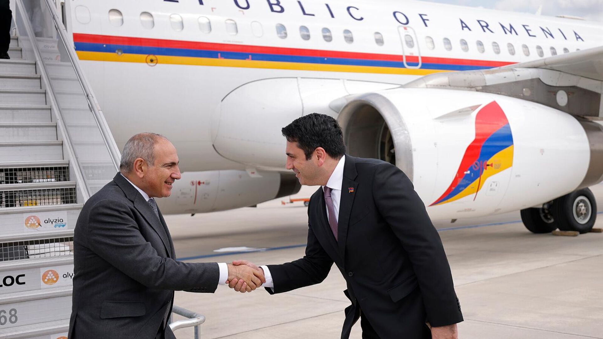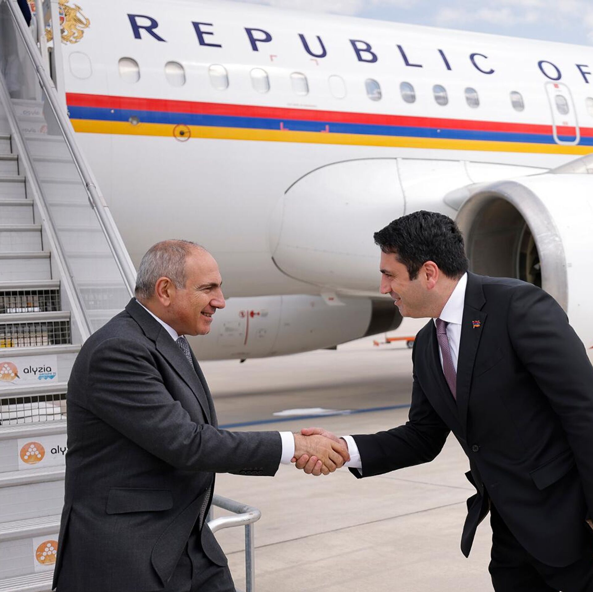 Հրապարակված կադրերում երևում է, որ օդանավից իջնող Փաշինյանին դիմավորում է ԱԺ նախագահ Ալեն Սիմոնյանը։