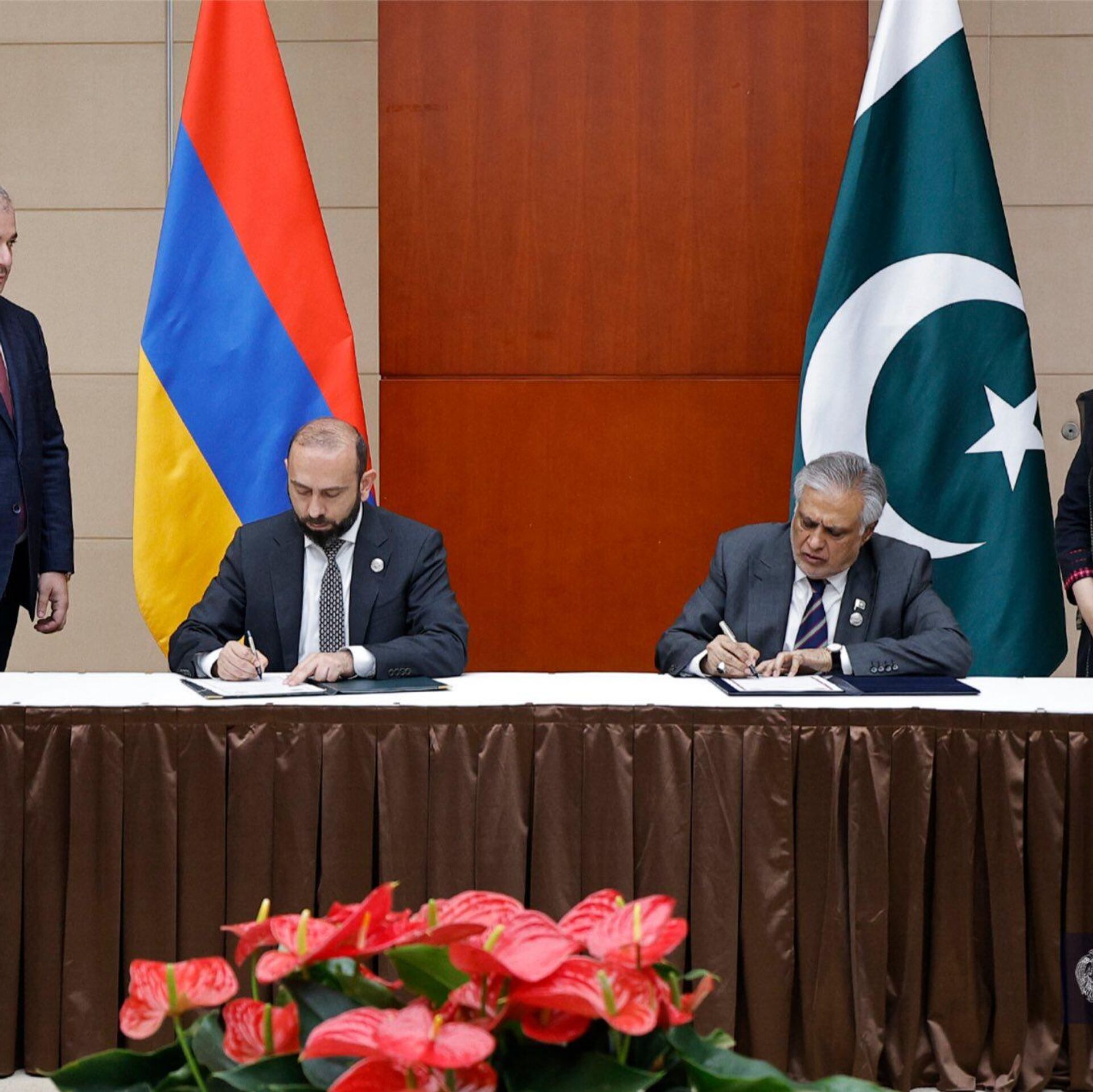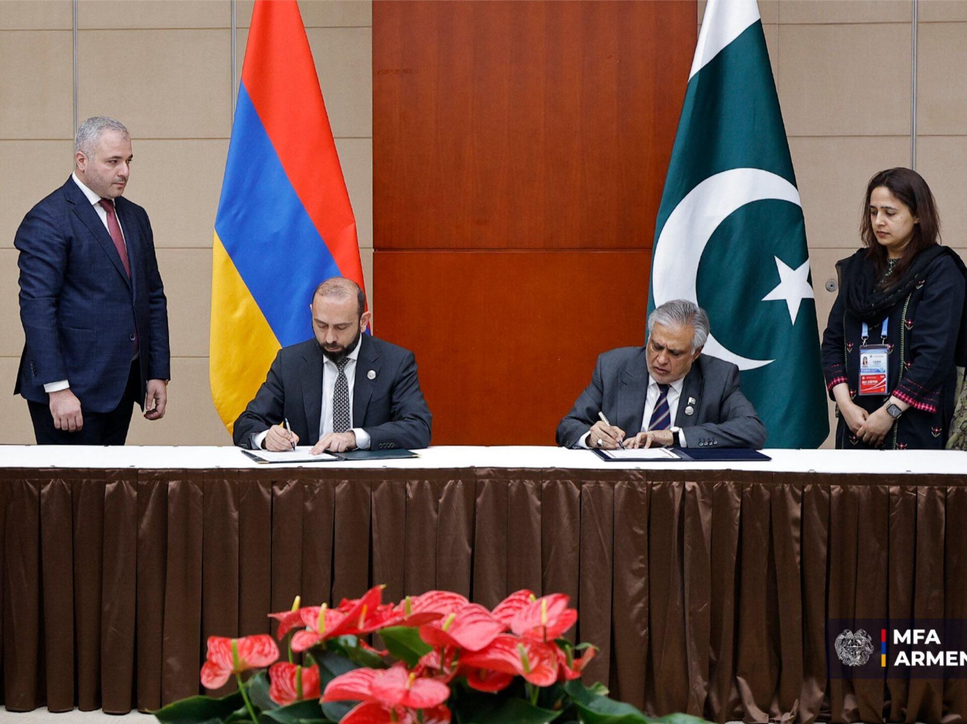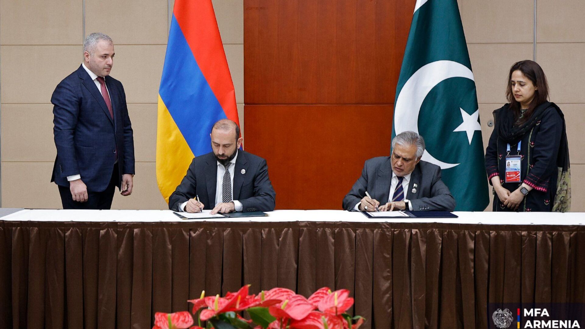 Նշենք, որ կոմյունիկեն ստորագրել են Չինաստանում գտնվող Հայաստանի Հանրապետության արտաքին գործերի նախարար Արարատ Միրզոյանը և Պակիստանի Իսլամական Հանրապետության փոխվարչապետ և արտաքին գործերի նախարար Մոհամմադ Իշաք Դարը։