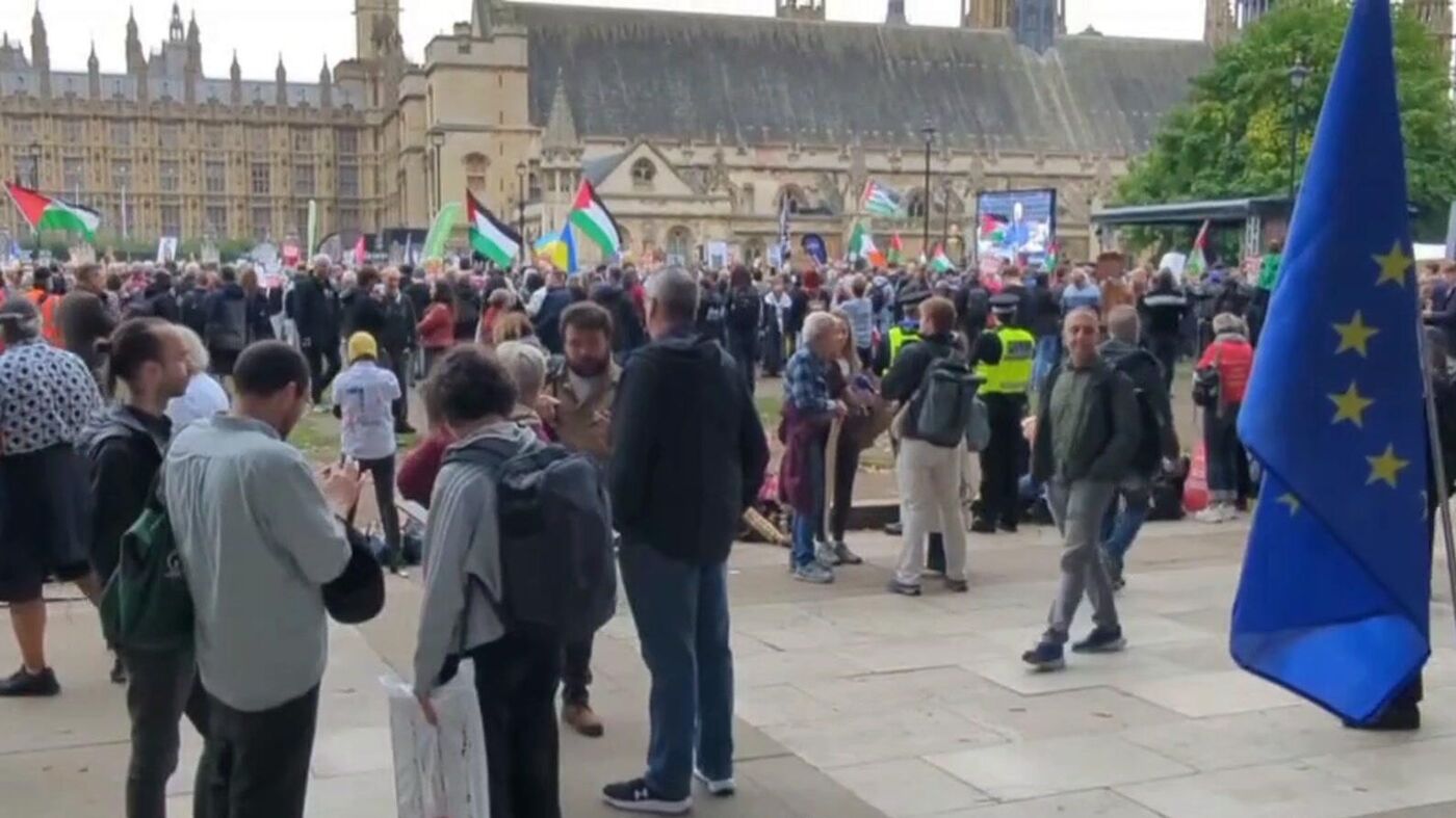 Ցուցարարներից շատերը Պաղեստինի դրոշներ են պահում` կարգախոսներ հնչեցնելով ի աջակցություն Գազայի, և պահանջում են դադարեցնել Իսրայելին զենքի մատակարարումները։