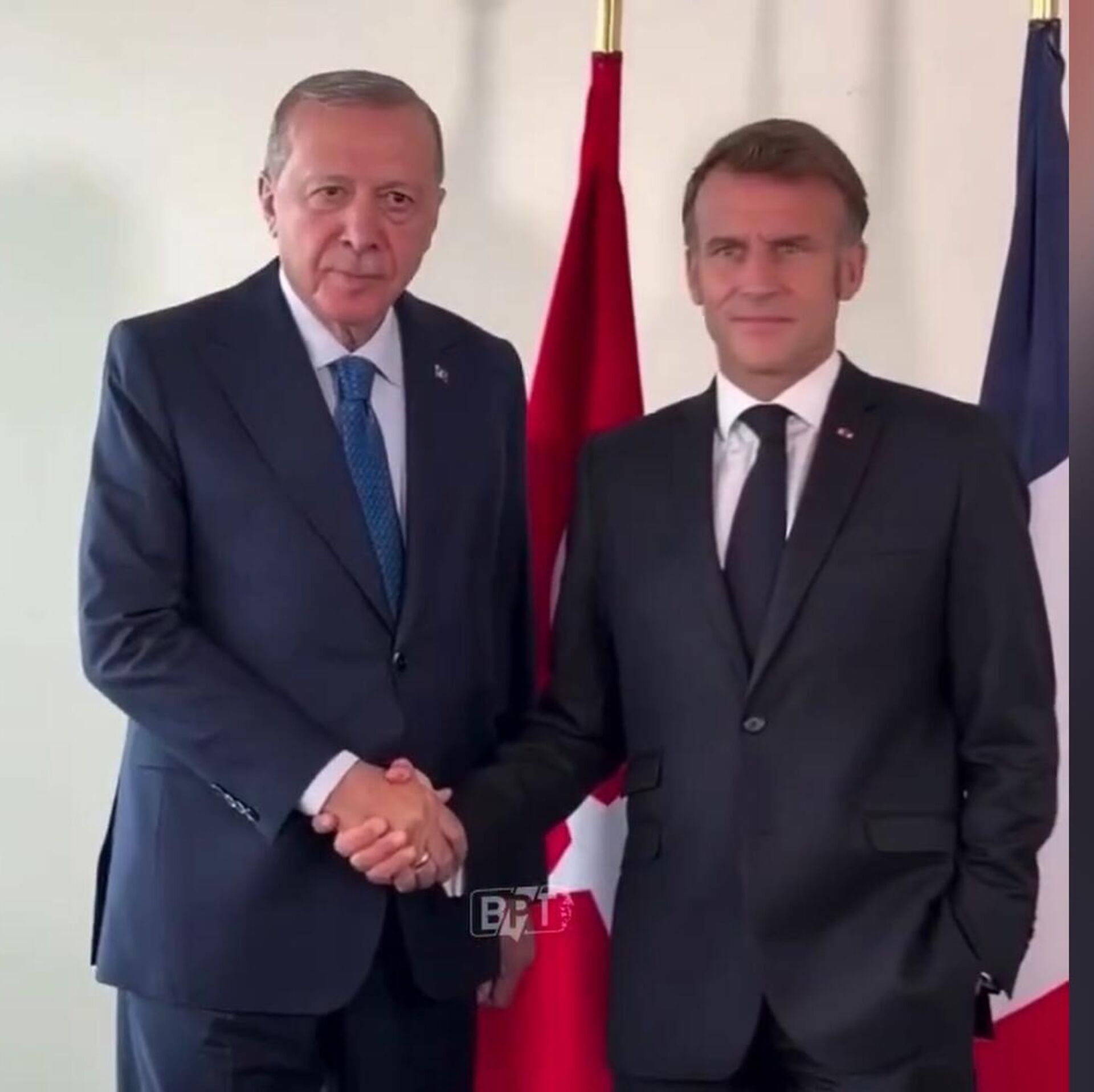 Սկզբում Թուրքիայի առաջնորդ Ռեջեփ Էրդողանը ողջունել է ֆրանսիացի գործընկեր Էմանուել Մակրոնին։ Մակրոնը հարցրել է, թե ինչպե՞ս է Էրդողանը։Թուրքիայի նախագահը, ըստ երևույթին, ակնարկում էր Ֆրանսիայի նախագահին անդադար հետապնդող քաղաքական խնդիրներն ու սկանդալները։Հիշեցնենք, որ մայիսին Տիրանայում կայացած Եվրոպական քաղաքական համայնքի գագաթնաժողովում Ֆրանսիայի նախագահ Մակրոնը հընթացս ձեռքը դրել էր թուրք գործընկեր Էրդողանի ձեռքին։ Սակայն վերջինս, անվրդով դեմքի արտահայտությամբ, բռնել էր Ֆրանսիայի առաջնորդի մատը՝ ցույց տալով իր գերակայությունը։