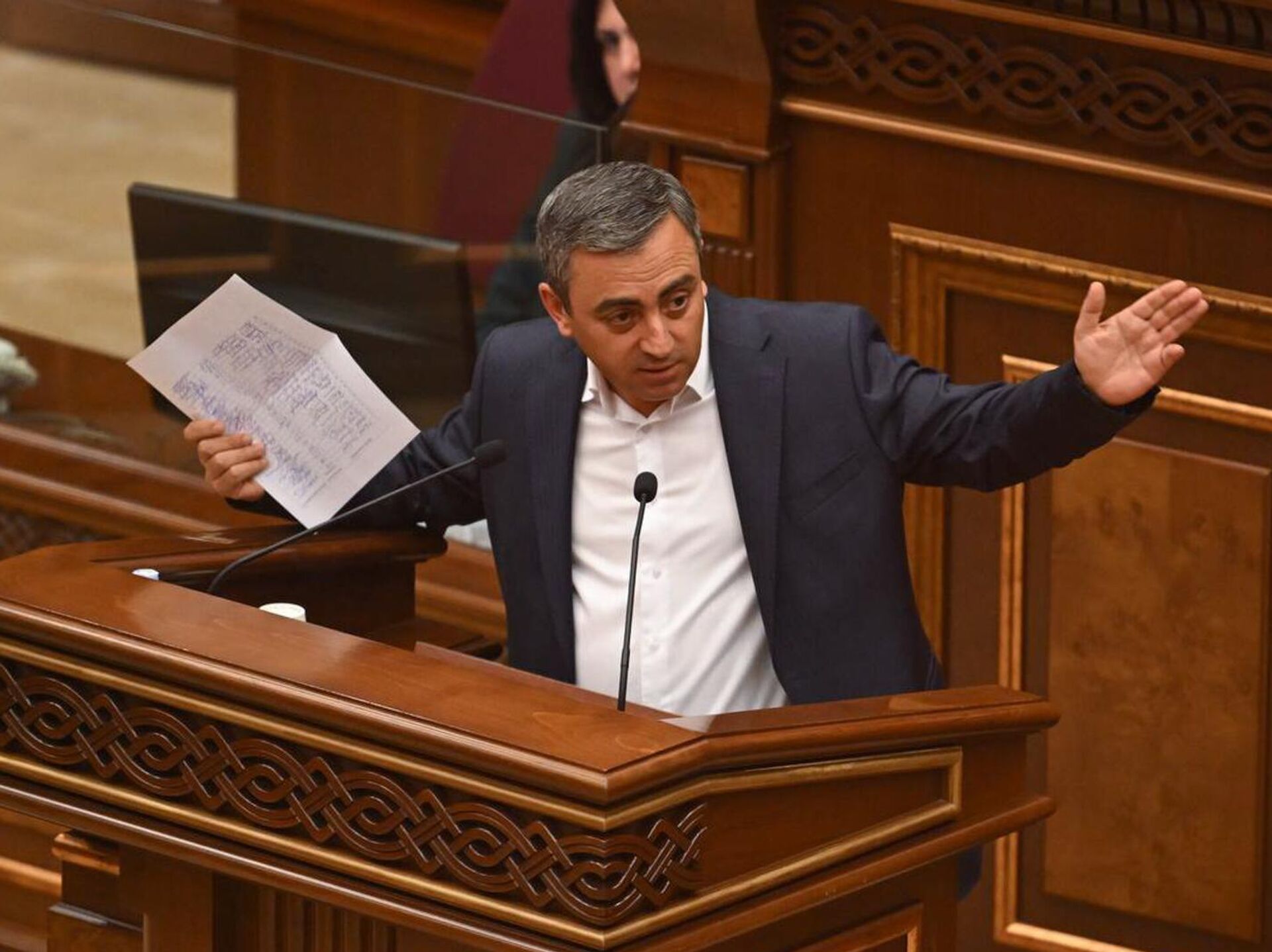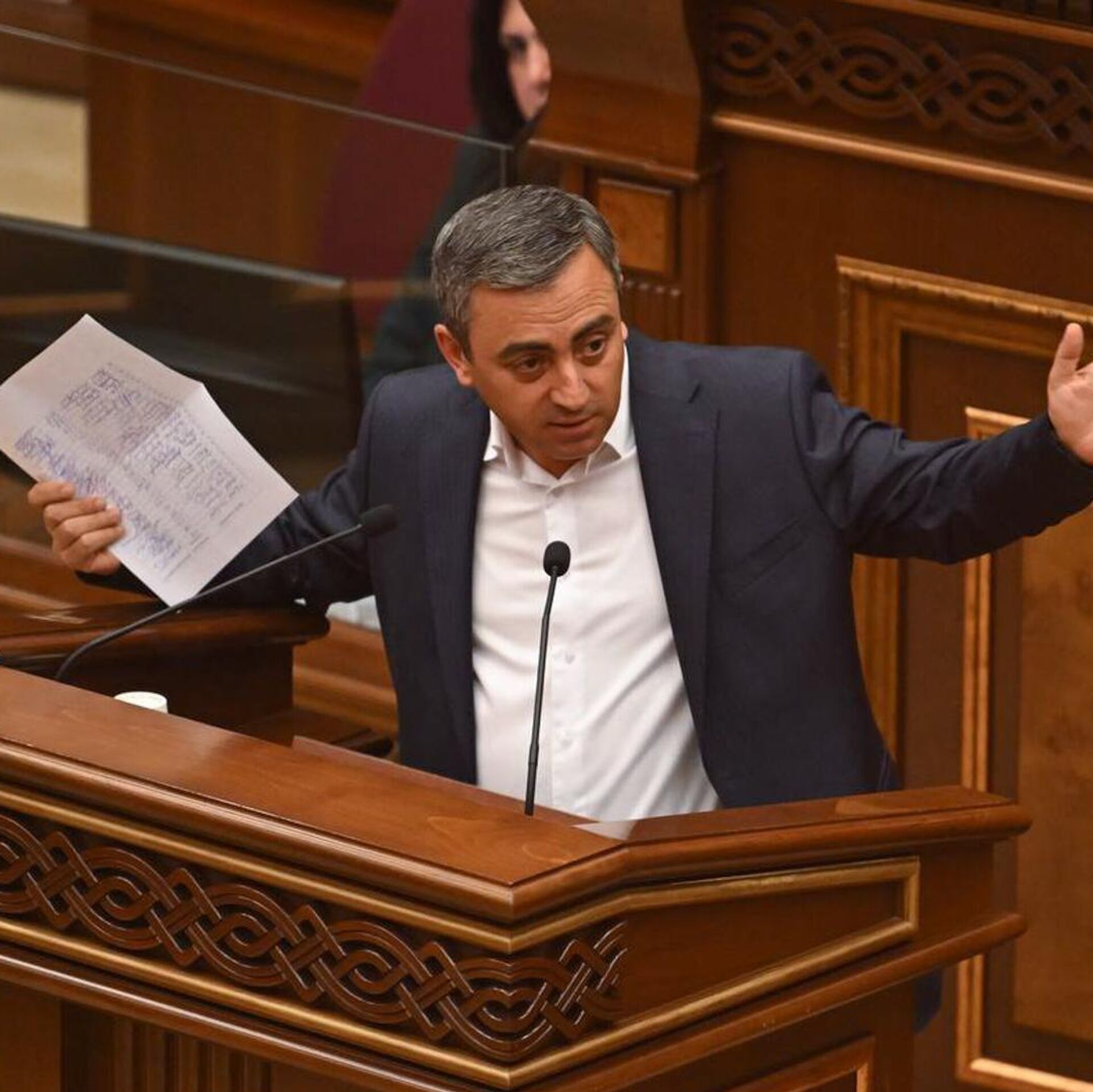 Ишхан Сагателян во время парламентских слушаний по инициативе фракции "Честь имею" (26 сентября 2025). Еревaн