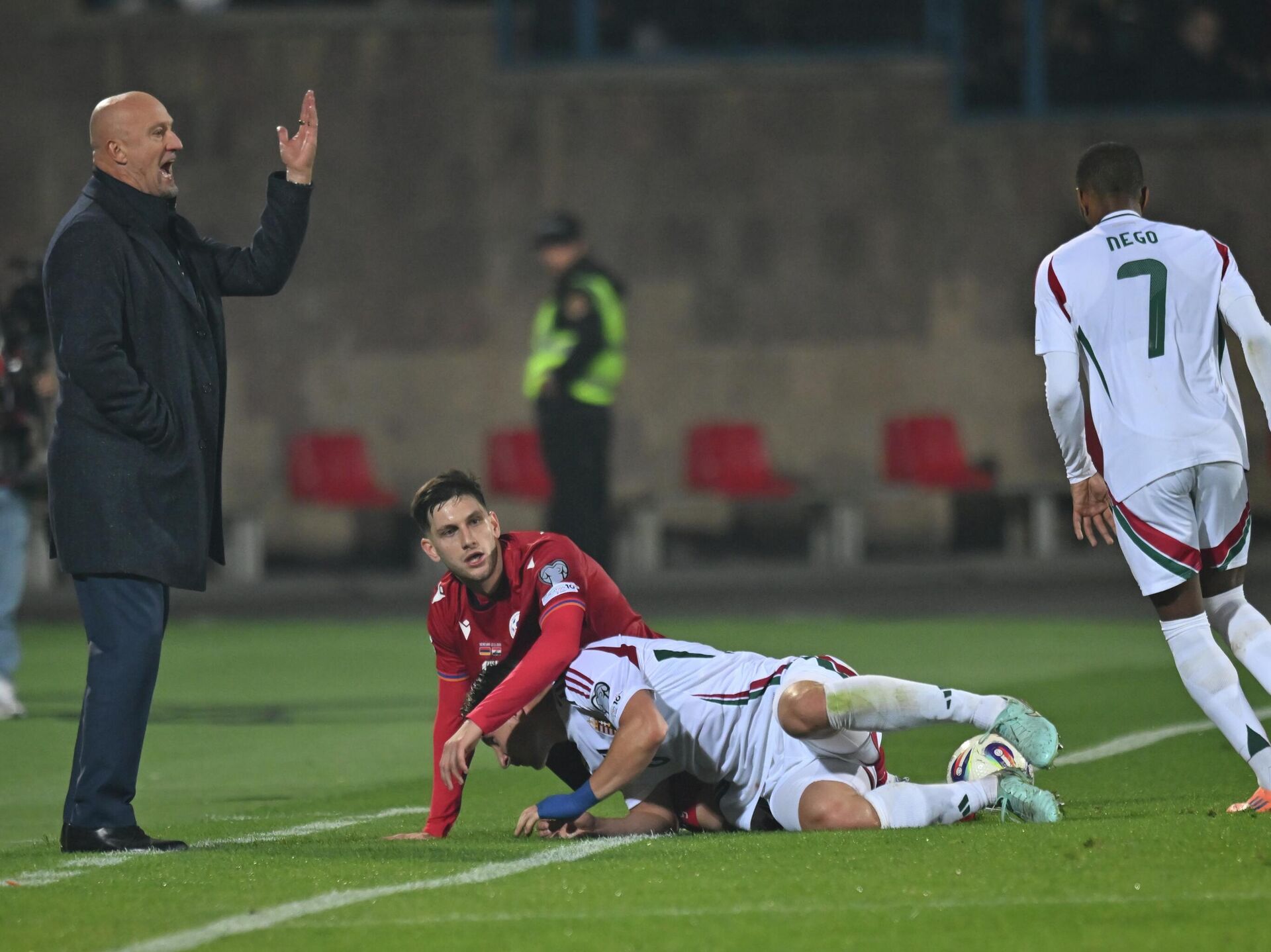 Մրցավար Խոսե Մարիա Սանչեսը դեղին քարտ է ցույց տալիս Հայաստանի հավաքականի գլխավոր մարզիչ Եղիշե Մելիքյանին