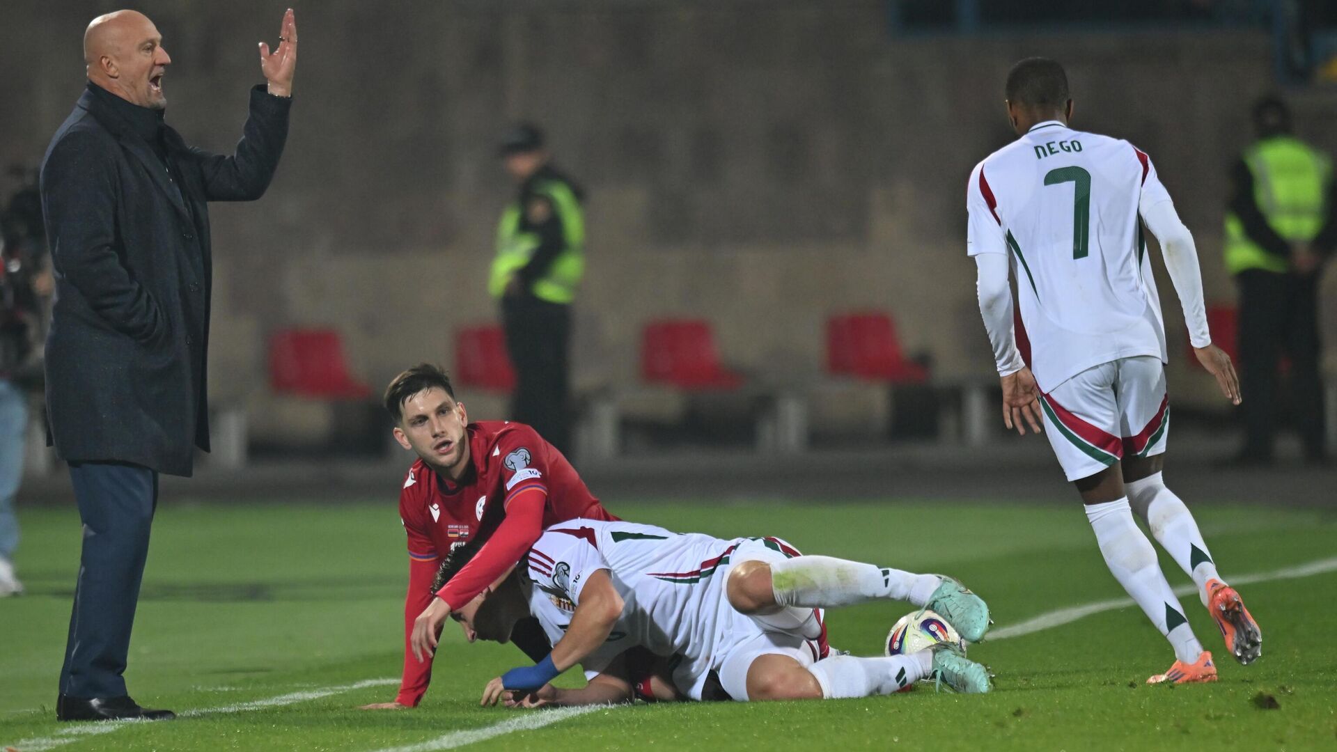 Մրցավար Խոսե Մարիա Սանչեսը դեղին քարտ է ցույց տալիս Հայաստանի հավաքականի գլխավոր մարզիչ Եղիշե Մելիքյանին - Sputnik Արմենիա