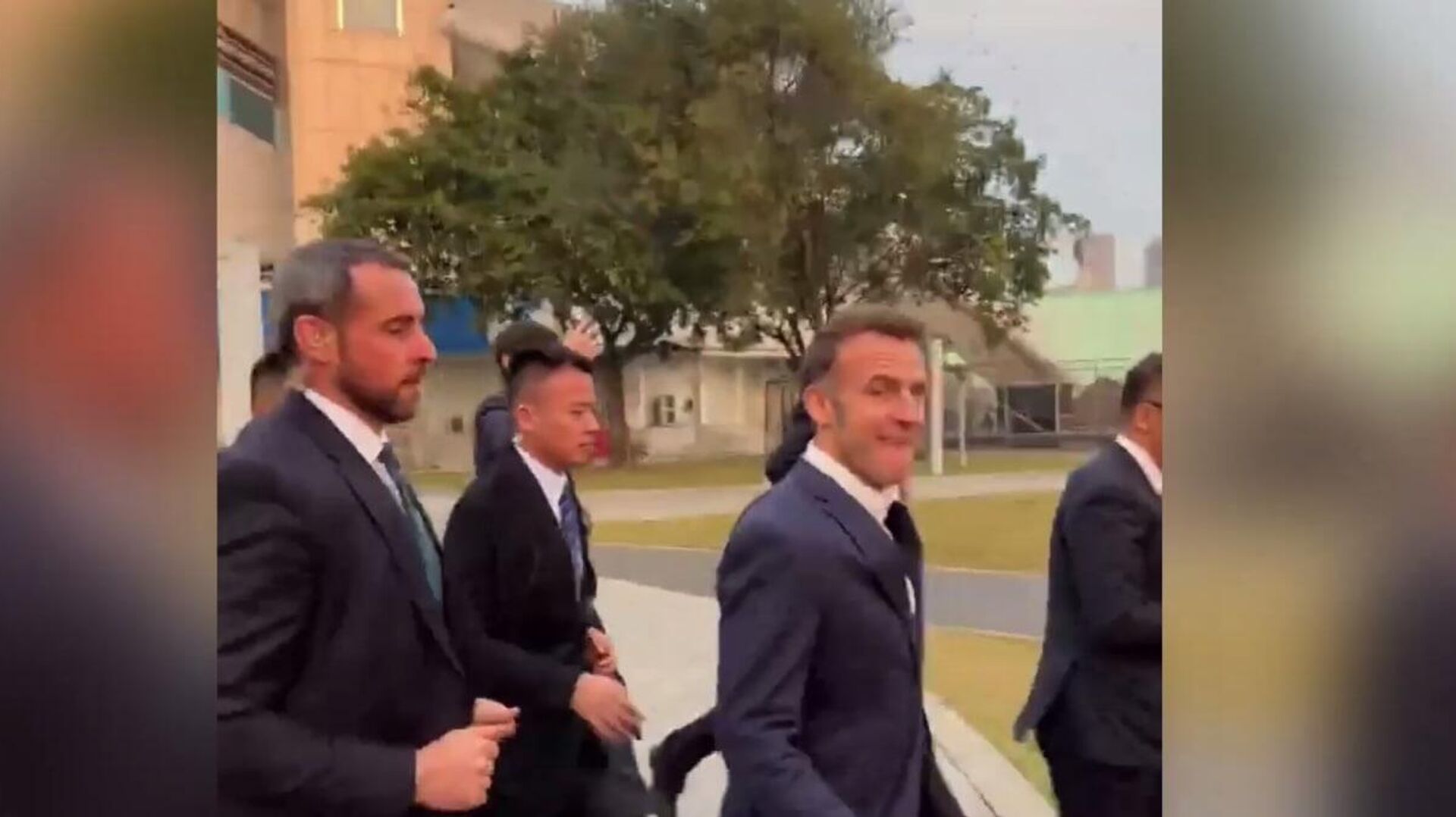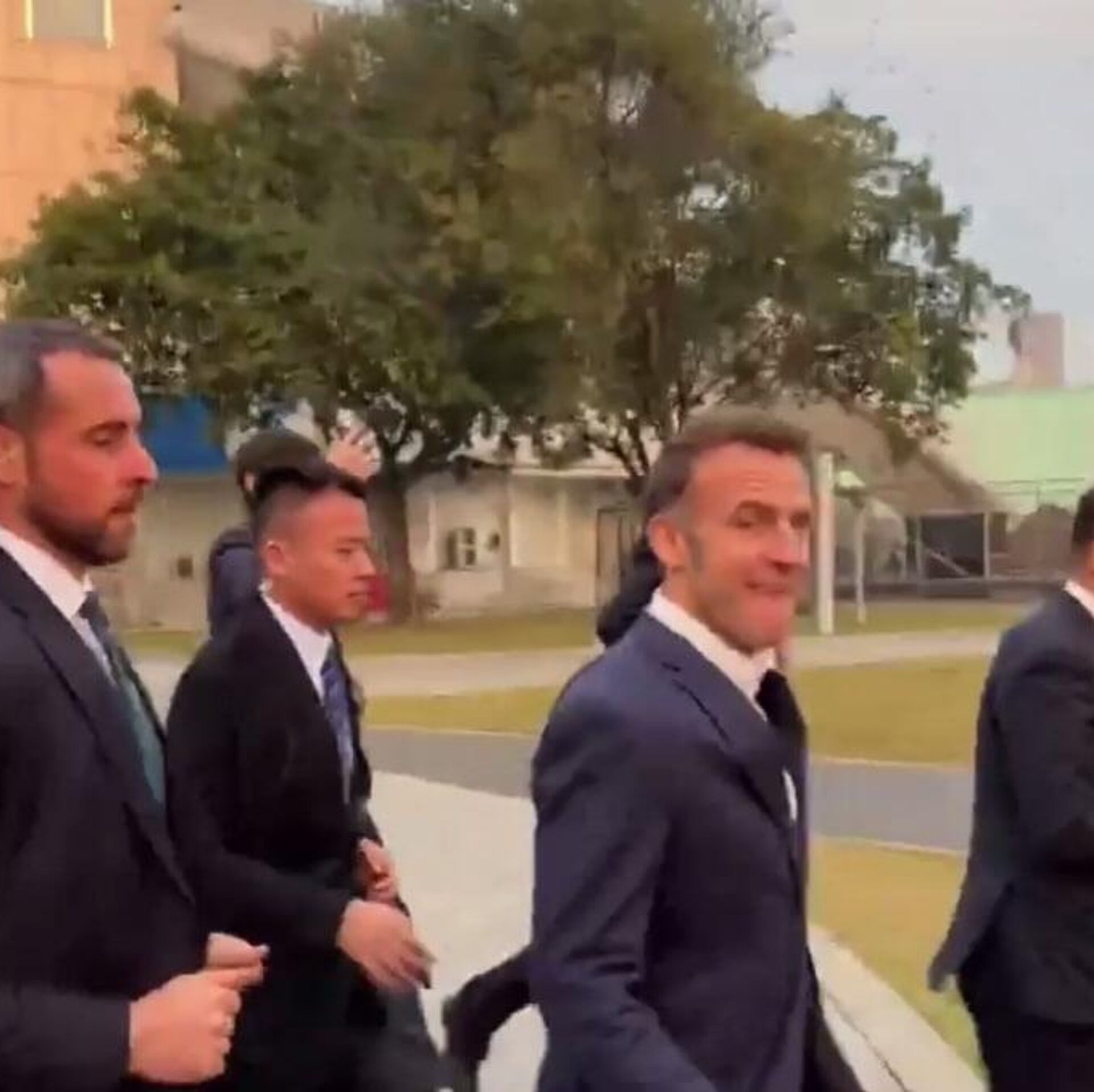 BFMTV-ի կադրերում երևում է` ինչպես է Ֆրանսիայի առաջնորդը դուրս գալիս մեքենայից և վազում դեպի ցանկապատը, նրան բնականաբար հետևում են չինացի անվտանգության աշխատակիցները։ Ֆրանսիացի առաջնորդի այս պահվածքն իսկական փորձություն էր առնվազն տասը անվտանգության աշխատակիցների համար։