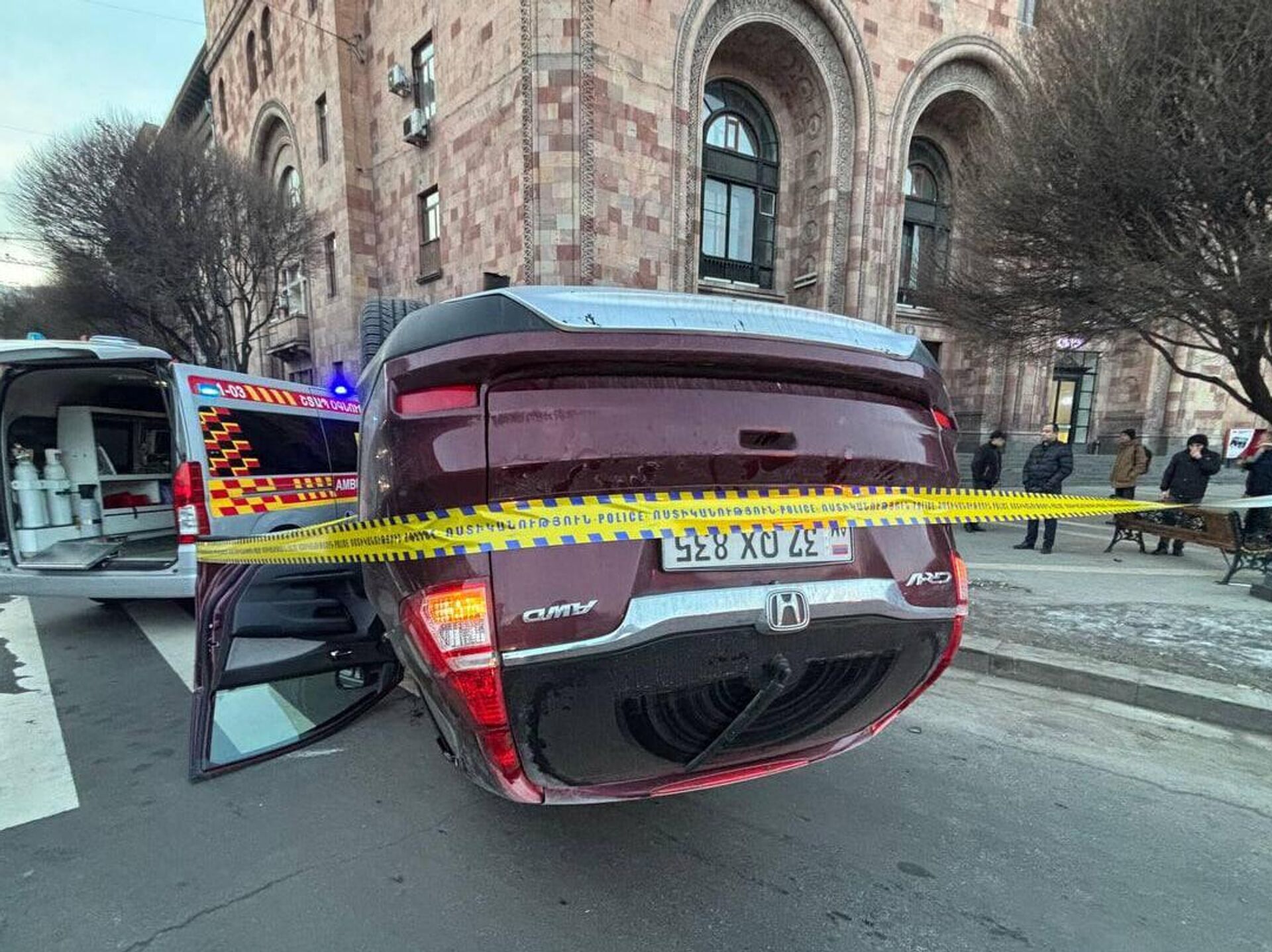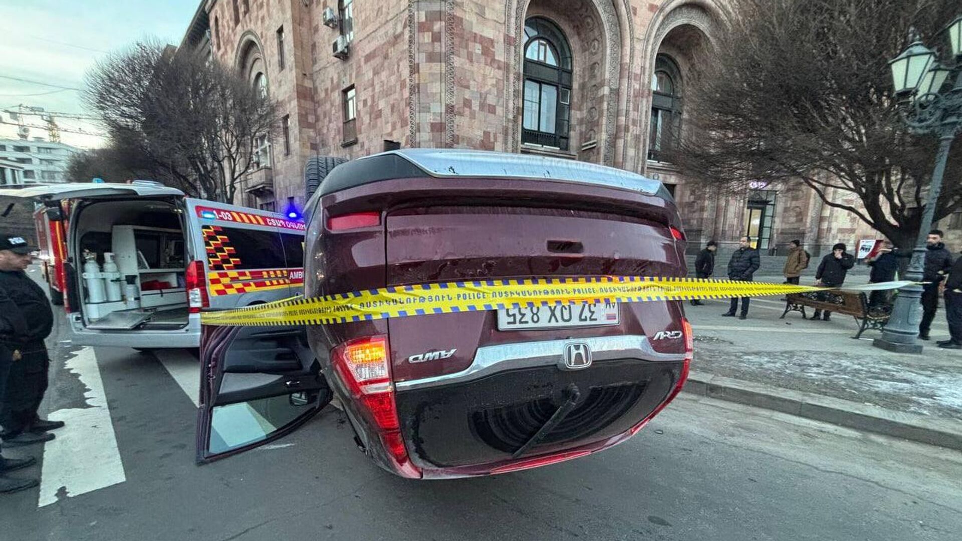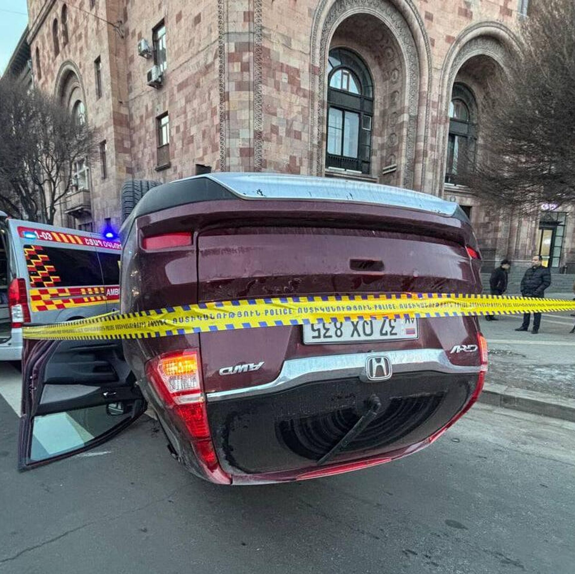 Ինչպես հայտնում է Sputnik Արմենիայի թղթակիցը, Honda մակնիշի մեքենան Հանրապետության հրապարակից դեպի Տիգրան Մեծ պողոտա ընթանալիս դուրս է եկել երթևեկելի հատվածից, ընթացել սիզամարգի վրայով, հարվածել կայանված Toyota մակնիշի ավտոմեքենային, այնուհետև լուսացույցին ու գլխիվայր շրջվել: